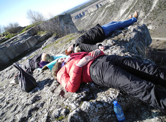 | День третий В первый день мы не добрались до плато Мангупа и Чуфут-Кале из-за туманов, поэтому перенесли экскурсии на второй день. И сегодня нам погода благоволила! Ярко сияло солнце, оттеняя синеву неба и белизну пушистых облаков. Плато Мангуп-Кале удивило нас не столько историческими развалинами и пещерами, сколько великолепнейшим панорамным видом! Глаз радовался далёким заснеженным вершинам гор, рассыпавшимся долинам под ногами и блеску озера у подножья плато. Чуфут-Кале понравился всем своими сохранившимися средневековыми строениями, пещерами и абсолютной тишиной. А сев на краю обрыва этого «города», начинаешь всматриваться в бесконечный простор, чувствуя, как тебя наполняют силы. |