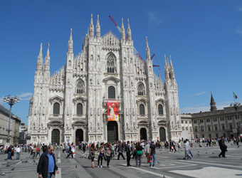 Путешествие началось с Милана.Оставив сумки в хранилище на вокзале, мы направились в центр. Там мы познакомились с главной достопримечательностью города - Миланским собором.Белый мраморный огромный собор в стиле пламенеющей готики поразил каждого. Величественные шпили, устремляющиеся в небо, и позолоченная Мадонна, возвышающаяся над городом, завораживают взгляд. Заходя внутрь, поражаешься, как быстро погружаешься в Средневековье, тишину и глубину размышлений. Вдоволь нагулявшись по Миланскому собору и его крыше, пройдя мимо театра La Scala и главной торговой галерее, мы отправились на центральный вокзал, где нас ждал поезд в Венецию. Ночь мы сладко спали уже в Венеции