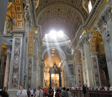 Если говорить о соборе как о монументальном сооружении, то он, конечно же, поражает своим величием и грандиозностью. Весь покрыт мрамором, великолепными скульптурами Бернини и шедевром Микеланджело - Пьета.Над собором красуется величественный купол, спроектированный Микеланджело, на который мы, конечно же, поднялись. После осмотра всего собора, группа отправила открытки себе домой через Ватиканскую почту - дешёвую и быструю, а затем мы все отправились в итальянский местный ресторан отмечать знакомство с Ватиканом замечательным домашним вином.